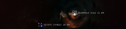 My persistence is rewarded with a second wormhole, my optimism deflated when I see it to be a K162 from null-sec. But now I have a ship appear on my combat scanning probes, and switching to d-scan shows it to be another Tengu. I wonder if the strategic cruiser has followed me in from high-sec but he's not at the K162 leading back to empire space. Neither is the ship at either exit to null-sec, so I have at least one more wormhole to find, even if there is a Tengu to get past to explore there.