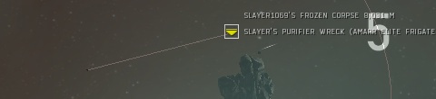 Less than a minute after I scoop, loot, and shoot the corpse and wreck of the Nemesis, the two Purifiers reappear, one almost on top of me and the other on the far side of Fin. I tell her to get out, knowing that a second bomb would destroy her ship, whilst I easily deal with my second bomber of the night. I don't quite know the motivation of the Purifier decloaking so close to me, as it is quite a sacrifice to make to keep the second safe, but perhaps its fitting of a warp core stabiliser helps explain that it thought it could get away from me. Not when I'm packing three points of warp disruption, sir. The Purifier and its pilot suffers the same fate as the Nemesis.